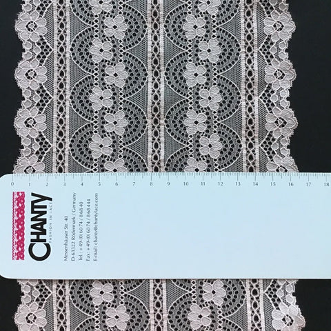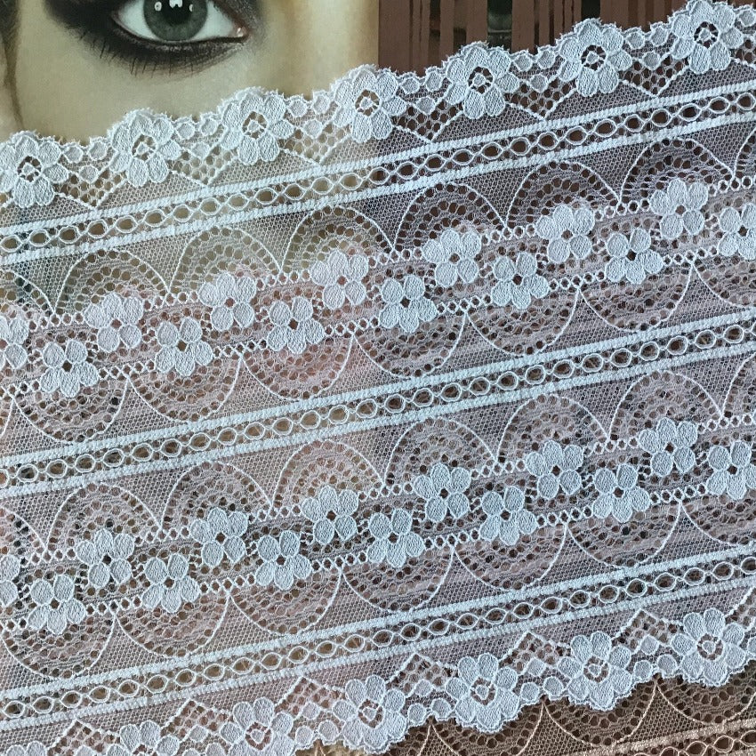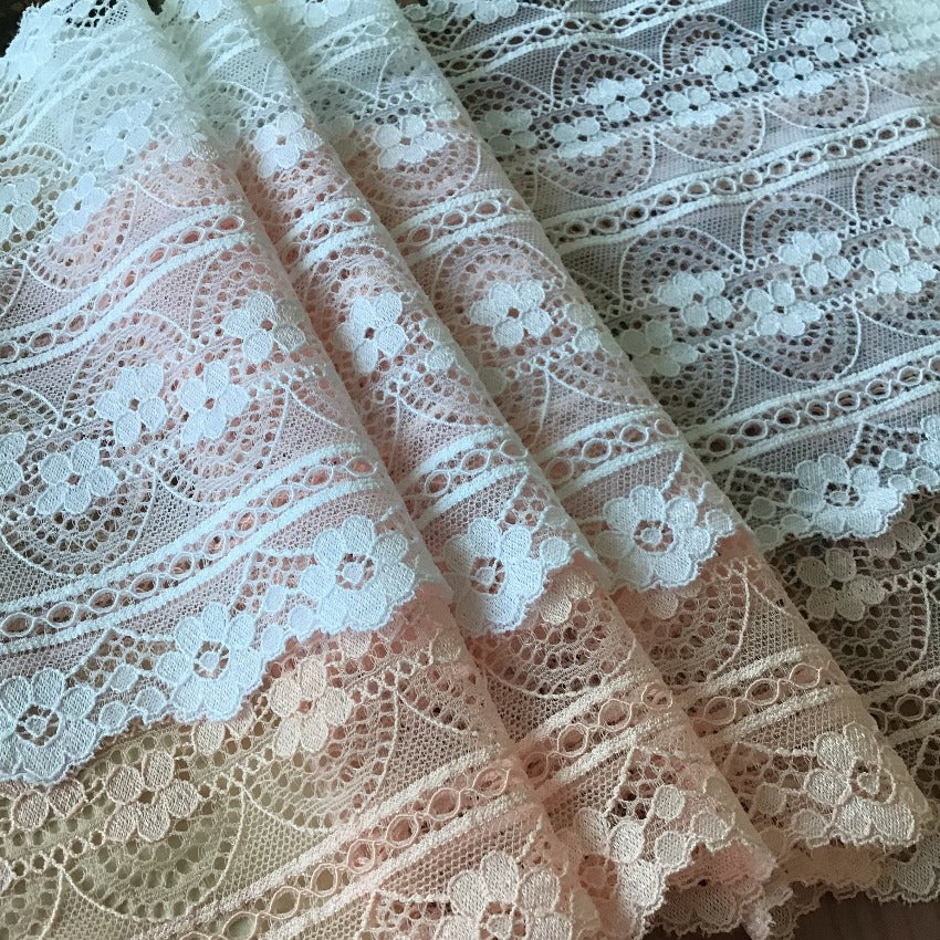 Die "Dehnbarkeit" der Breite kommt von den ganzen Löchern eines Spitzendesigns. Damit das Design seine ursprüngliche Form beibehält, dehne die Spitze nicht zu viel beim Nähen, ansonsten gibt es später Falten.