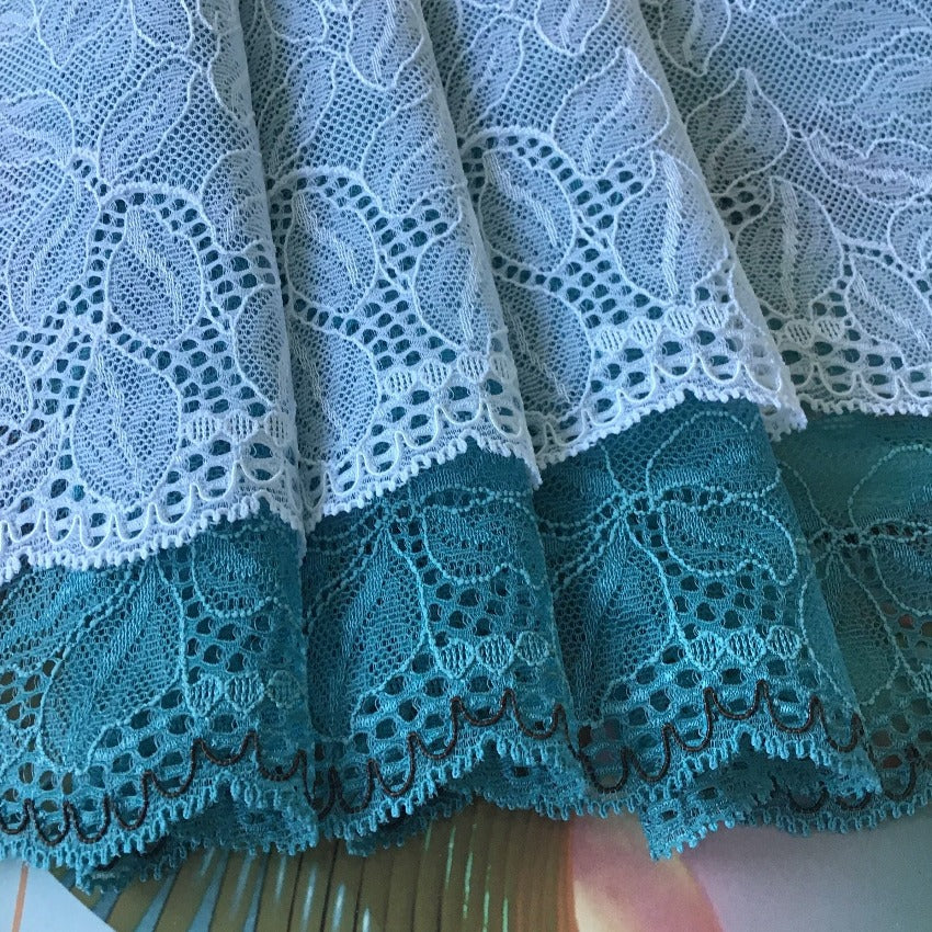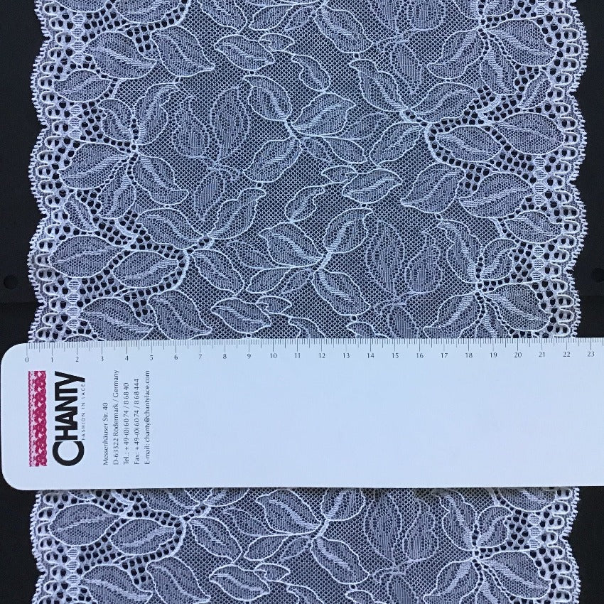 Die "Dehnbarkeit" der Breite kommt von den ganzen Löchern eines Spitzendesigns. Damit das Design seine ursprüngliche Form beibehält, dehne die Spitze nicht zu viel beim Nähen, ansonsten gibt es später Falten.