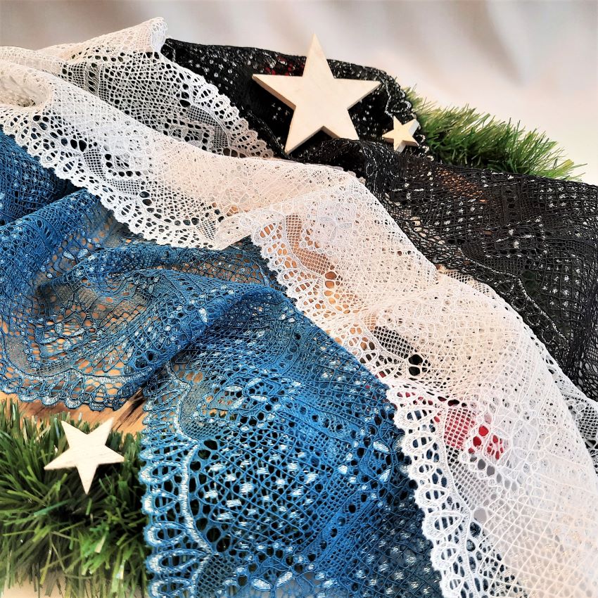 Lurex-Garn ist nicht so weich wie die anderen Garne, die wir normalerweise verwenden. Daher empfehlen wir, bei direktem Hautkontakt mit der Spitze eine weichere Stofflage darunter zu tragen.