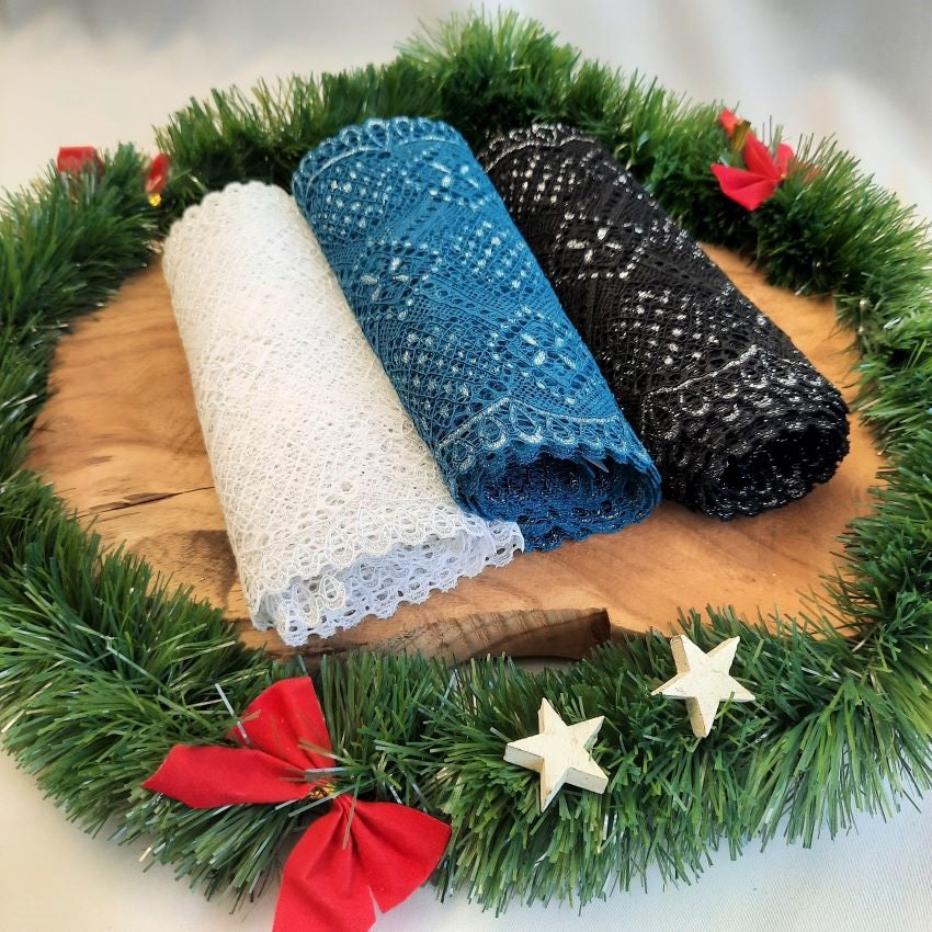 Depending on the quantity, lace fabrics will either be put onto a roll/spool and packed into cartons or, if the quantity is low, they may also be just folded and put into an envelope. The meterage per roll/spool varies depending on the width.