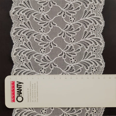 The 'stretchiness' of the width comes from all the holes of the design. To keep the design clean, take care not to stretch the laces too much while sewing, else it will create creases, when you let it go.