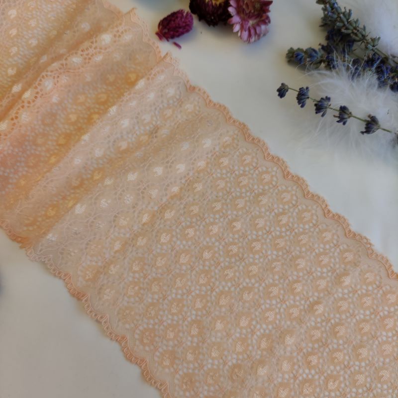 Depending on the quantity, lace fabrics will either be put onto a roll/spool and packed into cartons or, if the quantity is low, they may also be just folded and put into an envelope. The meterage per roll/spool varies depending on the width.