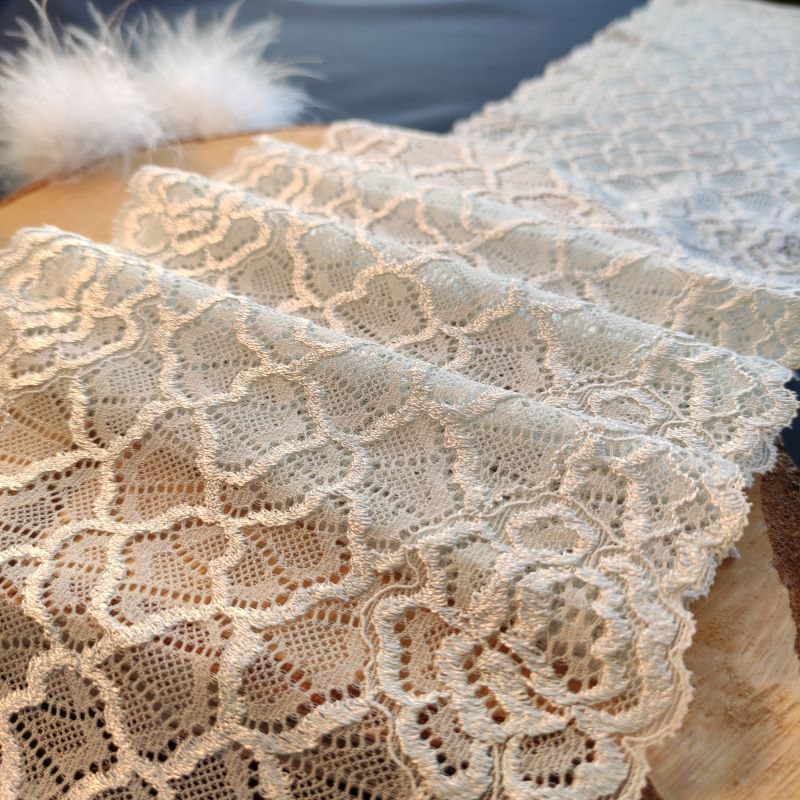 Depending on the quantity, lace fabrics will either be put onto a roll/spool and packed into cartons or, if the quantity is low, they may also be just folded and put into an envelope. The meterage per roll/spool varies depending on the width.