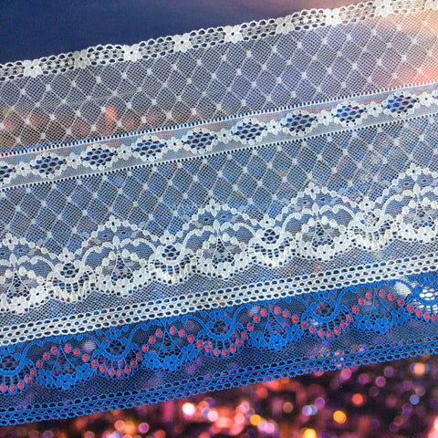 Lace TypeGalloon Laces are distinguished by having scallops or having other shape designs on both edges. They are mostly symmetrical and available in many widths, making them one of the most versatile lace types. These laces are usually elastic and stretchy. So you want to use some lace for something? Get yourself some Galloon laces! |