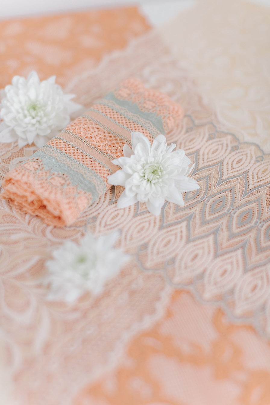 Did you know laces are typically only stretchable in their length and not width? Depending on the lace design it may seem like a lace can be stretched in width, but this is only because of the holes in the design. The elastane/spandex is woven in such a way, that it can only be stretched in length. This is a technical limitation from the machines that can be used for lace production.