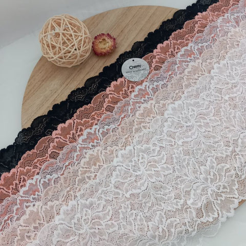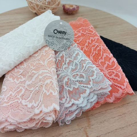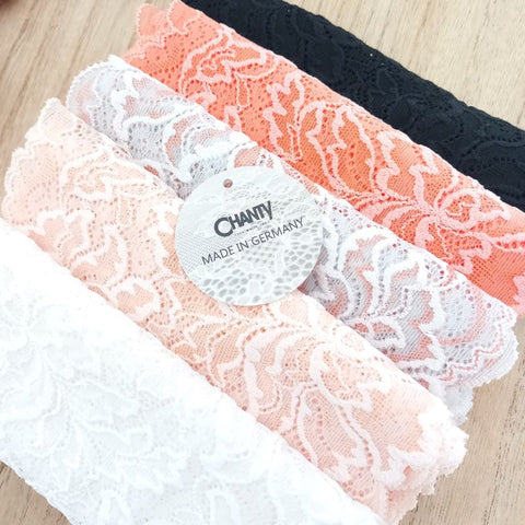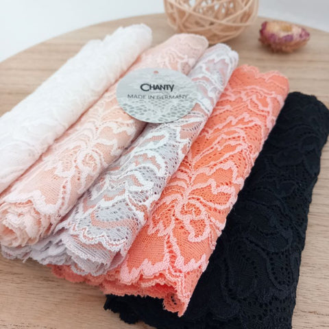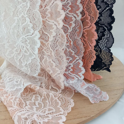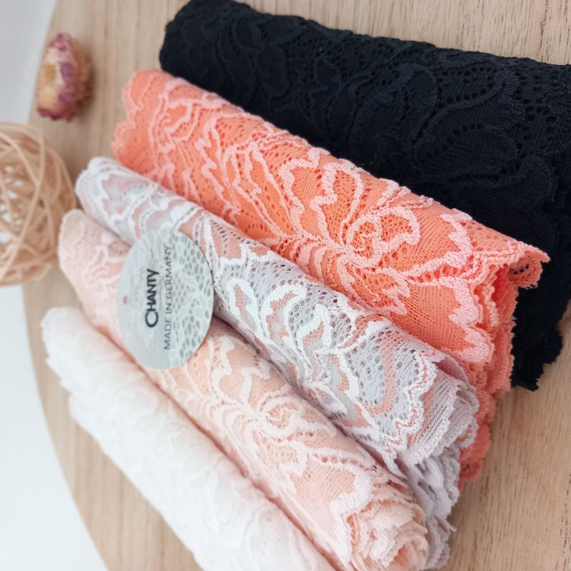 Depending on the quantity, lace fabrics will either be put onto a roll/spool and packed into cartons or, if the quantity is low, they may also be just folded and put into an envelope. The meterage per roll/spool varies depending on the width.