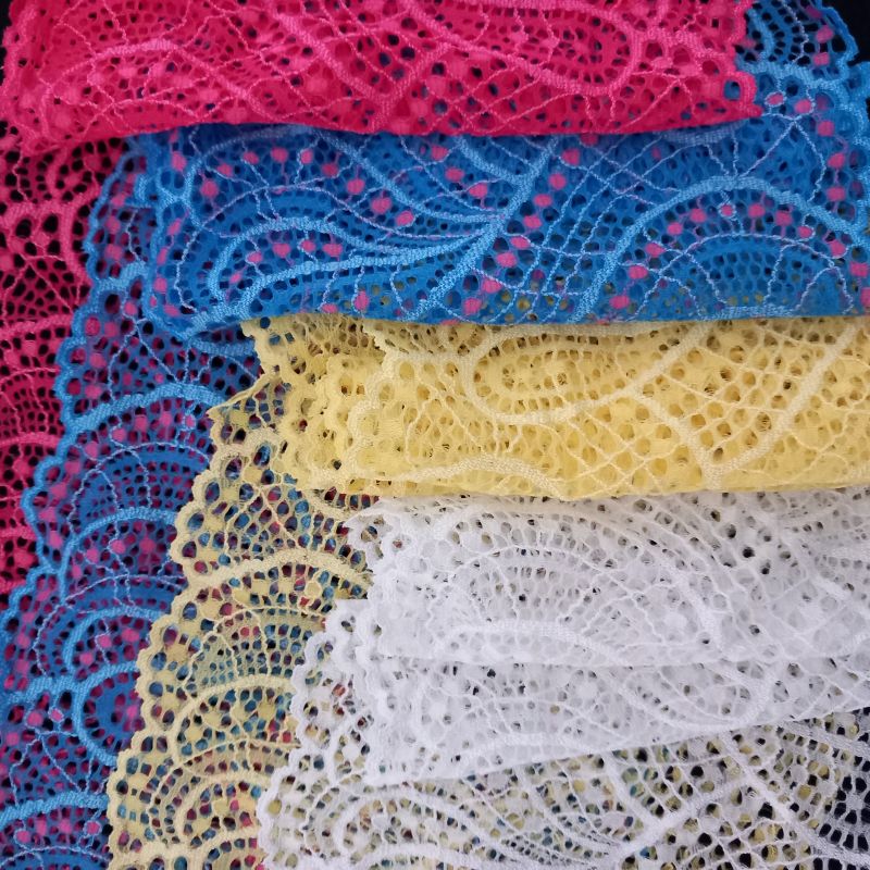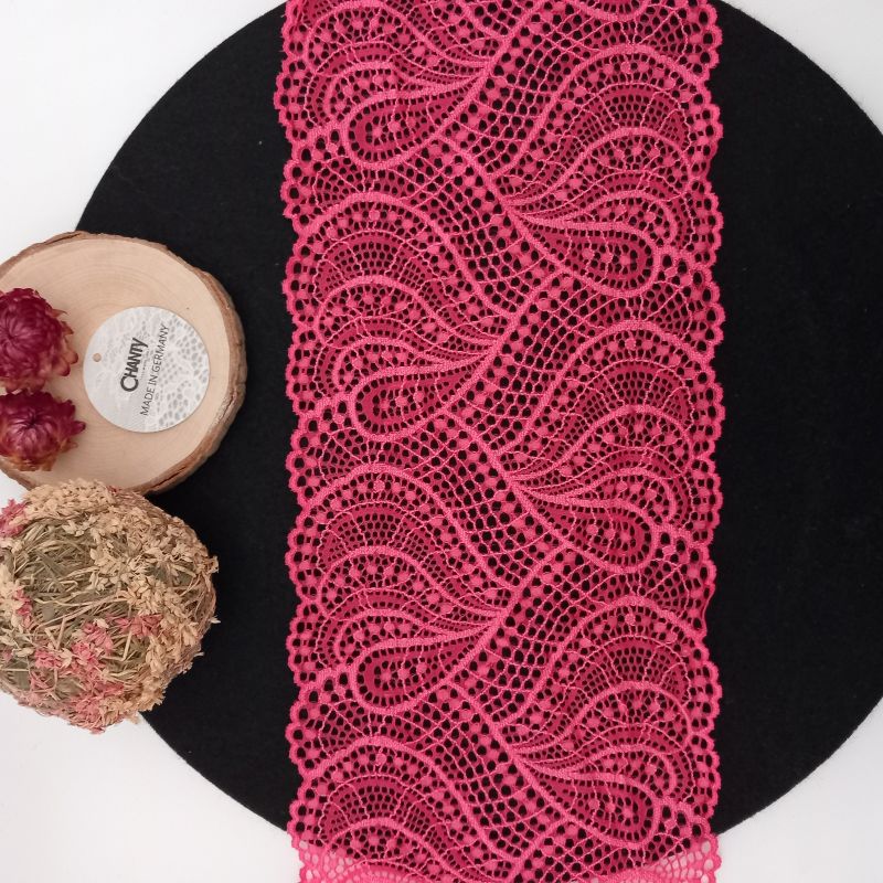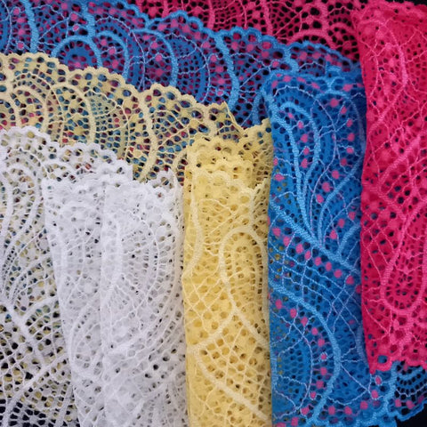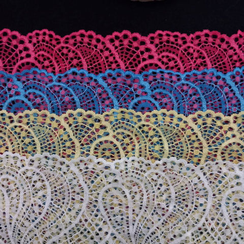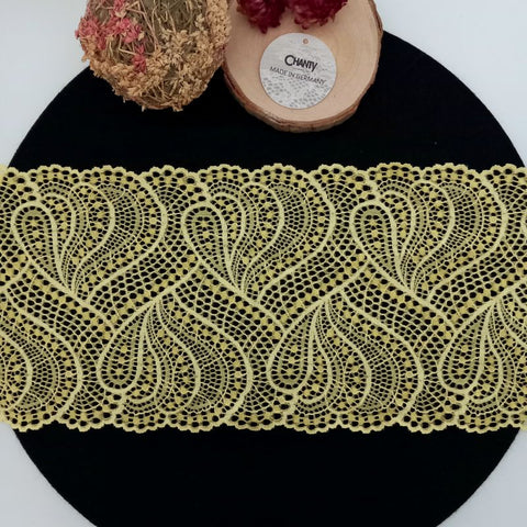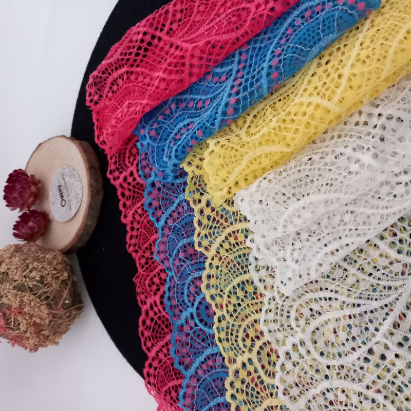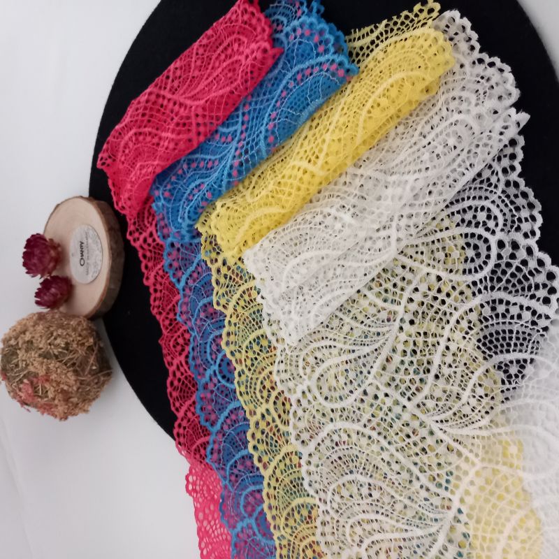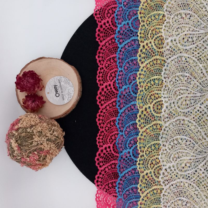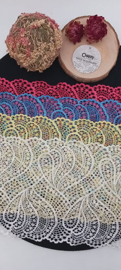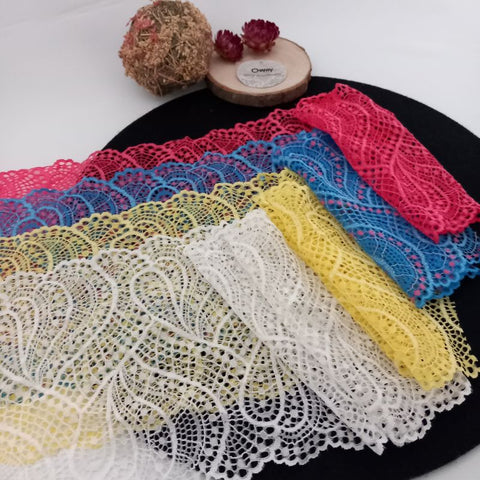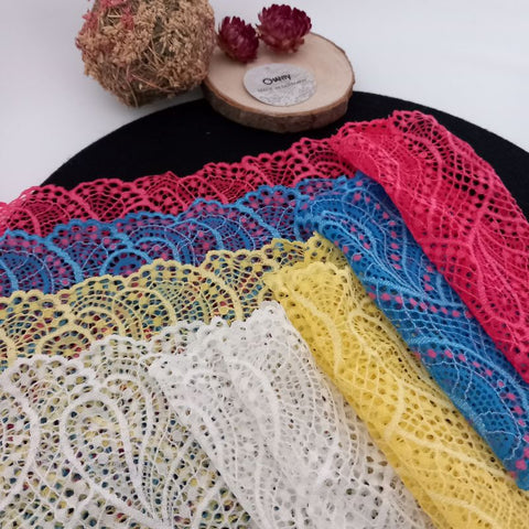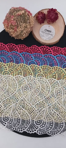 Lace TypeGalloon Laces are distinguished by having scallops or having other shape designs on both edges. They are mostly symmetrical and available in many widths, making them one of the most versatile lace types. These laces are usually elastic and stretchy. So you want to use some lace for something? Get yourself some Galloon laces! |