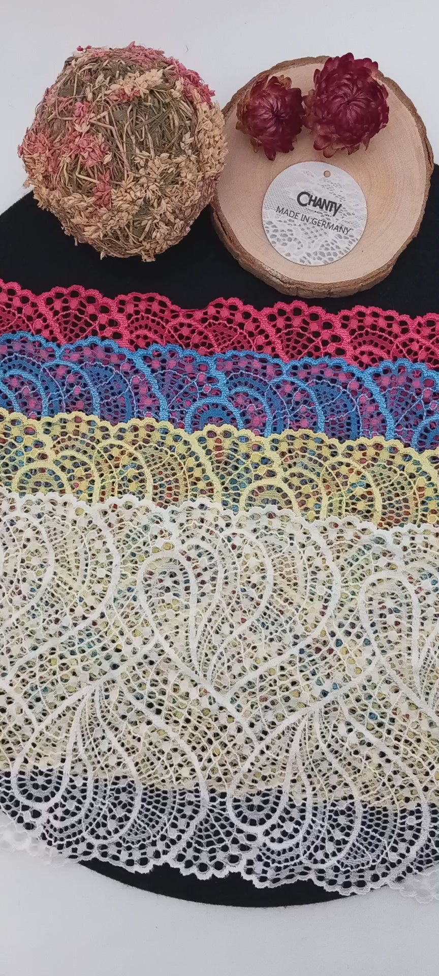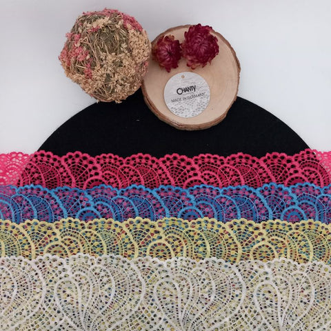 Use forDecoration, necklaces or sewn to the edges of dresses, shirts, skirts, underwear and used to create your own Dessous. You can also do inserts and cut outs or wrap a gift with these laces. Fitting for Bralettes, Slips or Lingerie Sets. There is no end to imagination on what to do with a Galloon lace. |