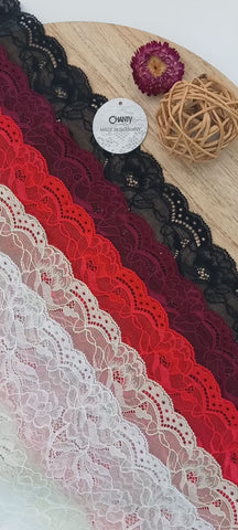 Lace TypeGalloon Laces are distinguished by having scallops or having other shape designs on both edges. They are mostly symmetrical and available in many widths, making them one of the most versatile lace types. These laces are usually elastic and stretchy. So you want to use some lace for something? Get yourself some Galloon laces! |