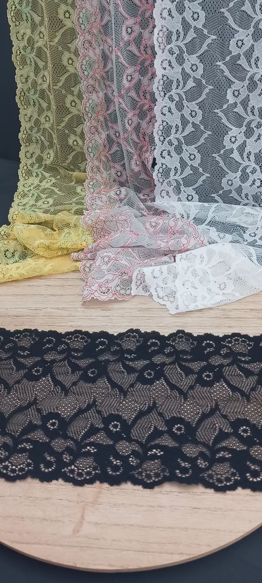 Depending on the quantity, lace fabrics will either be put onto a roll/spool and packed into cartons or, if the quantity is low, they may also be just folded and put into an envelope. The meterage per roll/spool varies depending on the width.