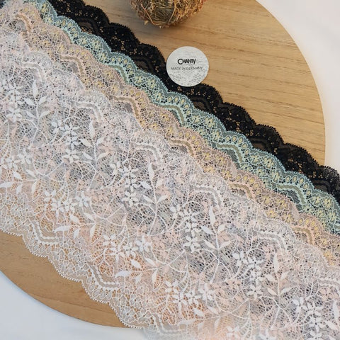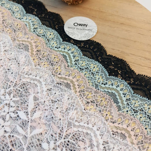 Lace TypeGalloon Laces are distinguished by having scallops or having other shape designs on both edges. They are mostly symmetrical and available in many widths, making them one of the most versatile lace types. These laces are usually elastic and stretchy. So you want to use some lace for something? Get yourself some Galloon laces! |