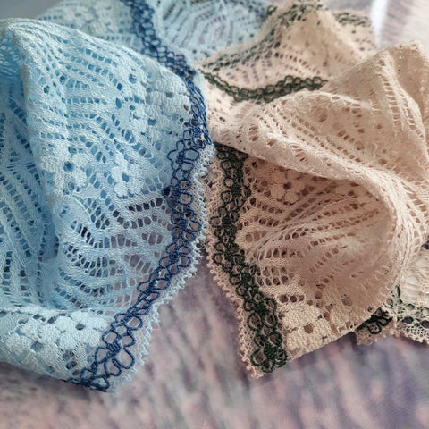 Lace TypeGalloon Laces are distinguished by having scallops or having other shape designs on both edges. They are mostly symmetrical and available in many widths, making them one of the most versatile lace types. These laces are usually elastic and stretchy. So you want to use some lace for something? Get yourself some Galloon laces! |
